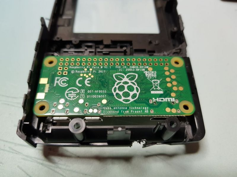 剔除电池槽口,为安装树莓派提供充足的空间。然后检查是否适合刚刚测试过的树莓派 Zero。但是,这里有一个标准的40排针插座和一个按钮垫片,它太占空间。因此,我决定换一款新的树莓派 Zero,不要排针插座,尝试后还是差一点。最后我移除树莓派的相机连接器,尺寸就严丝合缝了。