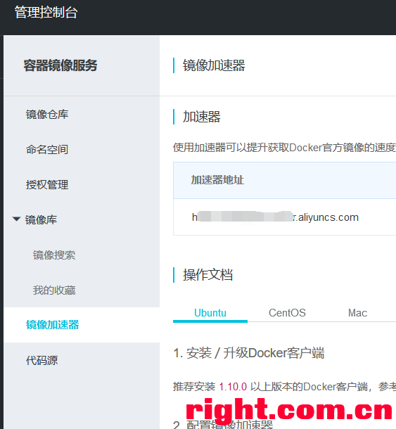 进入容器镜像服务,得到镜像加速器地址