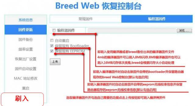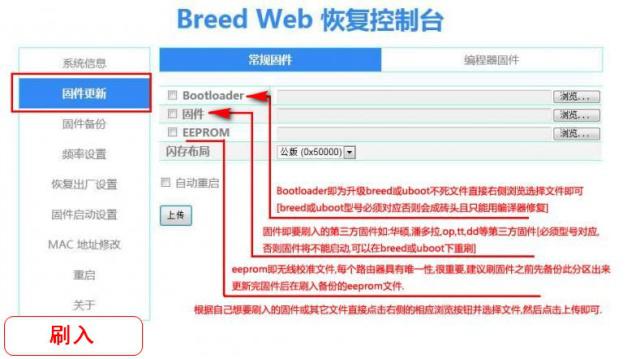 注意事项:第一个Bootloader就是breed,刷入这个会覆盖现有的breed一般用来升级breed使用,当然也可以更换成其他的Bootloader。第二个就是固件,常用breed来刷第三方固件就是从这里刷入,只需要点击后面的浏览,找到电脑中第三方路由器固件,然后上传后更新即可刷入。第三个EEPROM就是前面备份的无线路由器校准文件,一般无需刷入,除非路由器成砖后刷入breed,然后从这里刷入eeprom恢复无线信号和mac地址等。