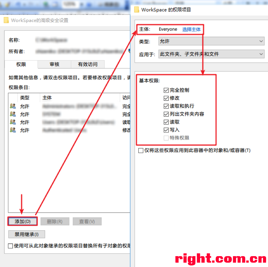 点击最下方的高级按钮,并按提示添加所有人完全控制权限