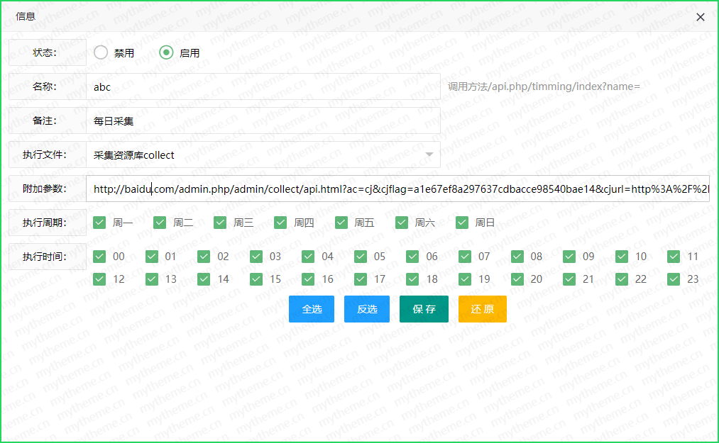 4.状态选为: 启用,名称和备注:可任写,附加参数:粘贴刚刚复制的链接,执行周期和执行时间的设置点击下面的全选按钮即可。