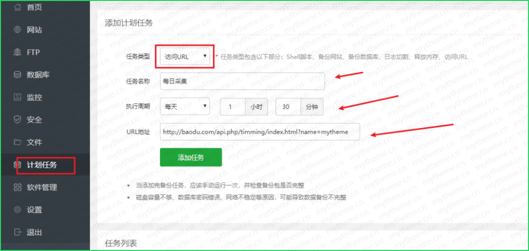 6.复制刚才的链接进入宝塔后台界面找到计划任务,按照图片所示添加任务,注意url地址填写刚复制的测试采集页面的地址,选择访问URL任务,按自己的需求填写执行周期参数后保存。