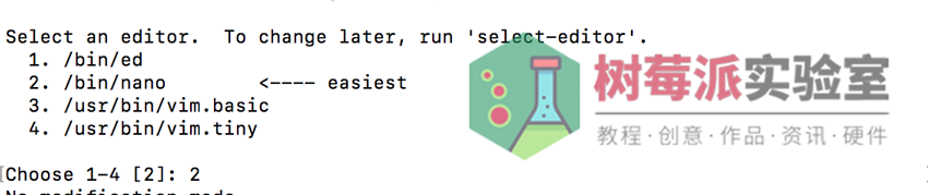 首次运行时会提示你选择一个编辑器,如果不知道选哪个就直接回车选择 Nano 编辑器。