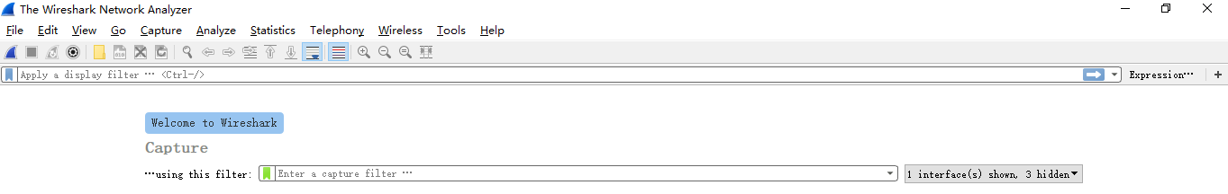 显示过滤器是用于在抓取数据包后设置过滤条件进行过滤数据包。通常是在抓取数据包时设置条件相对宽泛,抓取的数据包内容较多时使用显示过滤器设置条件顾虑以方便分析。同样上述场景,在捕获时未设置捕获规则直接通过网卡进行抓取所有数据包,如下