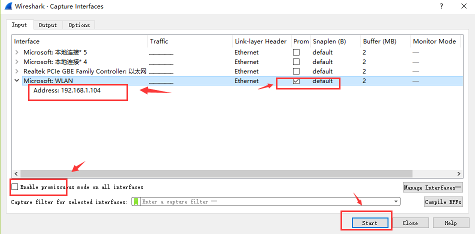 2、选择菜单栏上Capture -> Option,勾选WLAN网卡(这里需要根据各自电脑网卡使用情况选择,简单的办法可以看使用的IP对应的网卡)。点击Start。启动抓包。