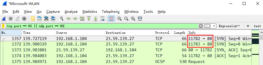 tcp.dstport == 80,只显示TCP协议的目的主机端口为80的数据包列表。