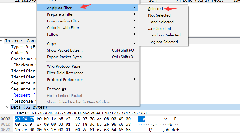 (7)按照数据包内容过滤。假设我要以IMCP层中的内容进行过滤,可以单击选中界面中的码流,在下方进行选中数据。如下