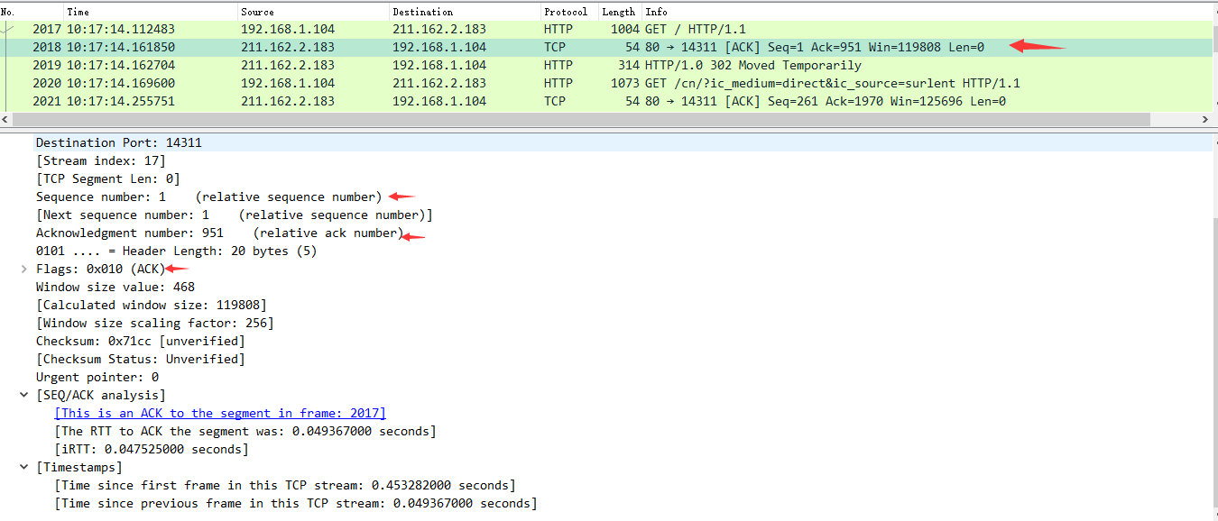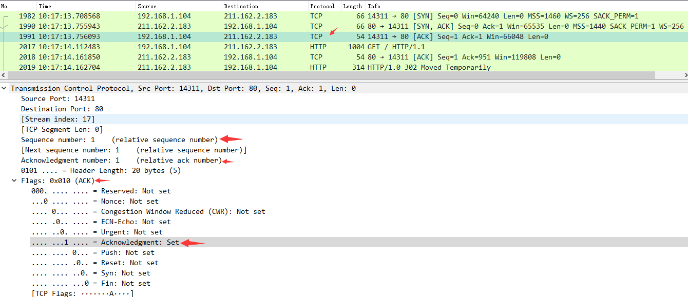 图中可以看到wireshark截获到了三次握手的三个数据包。第四个包才是HTTP的, 这说明HTTP的确是使用TCP建立连接的。