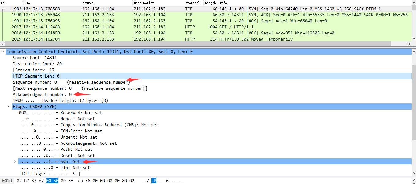 服务器发回确认包, 标志位为 SYN,ACK. 将确认序号(Acknowledgement Number)设置为客户的I S N加1以.即0+1=1, 如下图