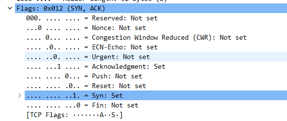Ack = 1 : 表示当前端成功接收的数据位数,虽然服务端没有发送任何有效数据,确认号还是被加1,因为包含SYN或FIN标志位(并不会对有效数据的计数产生影响,因为含有SYN或FIN标志位的包并不携带有效数据)。
