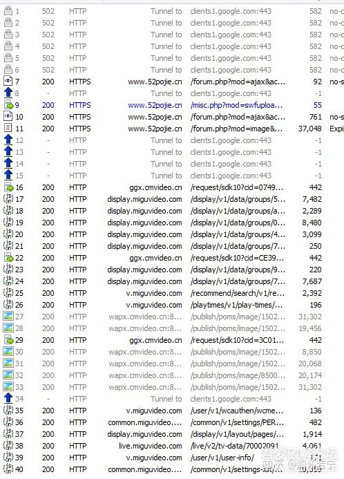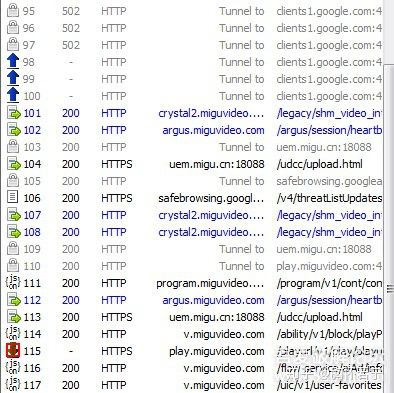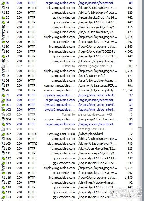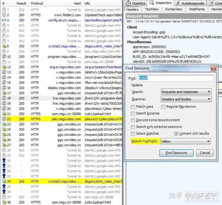 进行关键字查询,和OD的PUSH大法差不多,直播源的关键词是【m3u8】。首先我们需要查询咪咕视频的节目源是否是m3u8格式,因此搜索:m3u8,若出现黄色表示该请求含有m3u8.因此,我们需要看看这个封包。