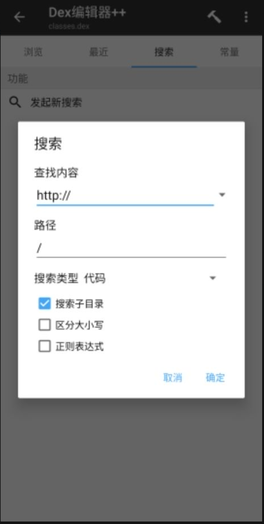 4、修改对接网址,点击classes.dex选择DEX编辑器,选择搜索“http://”,修改“http://47.56.70.129/iptv”为自己的地址。