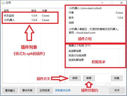 酷Q Air的插件格式为.cpk,将下载到的插件放到app文件夹,重启机器人即可完成插件安装。