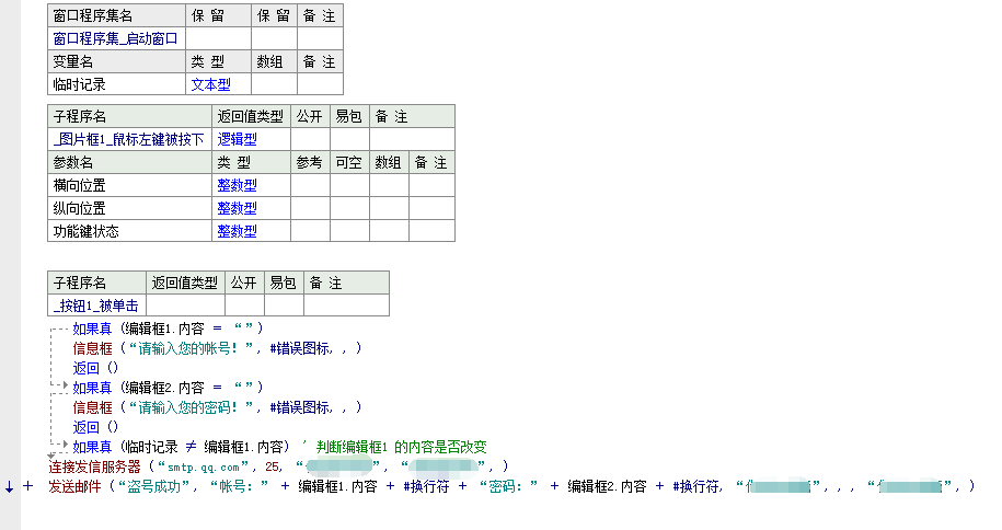 接下来就是写代码了。将下面的代码复制到“窗口程序集1”中。注意:下面的粗体字、斜体字改为真实的内容!