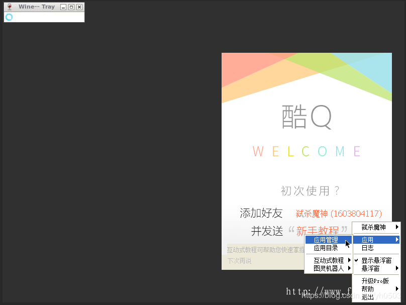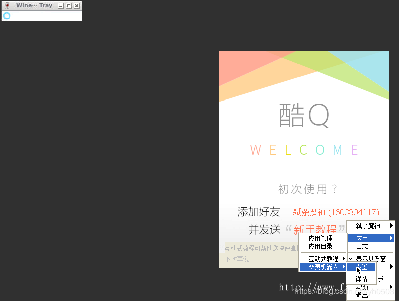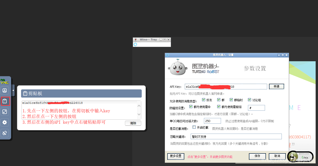 即可运行一个 wine-coolq 实例。运行后,访问 http://你的IP:9000 可以打开一个 VNC 页面,输入 MAX8char 作为密码后即可看到一个 酷Q Air 已经启动。