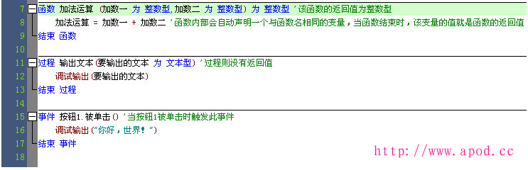 函数和过程都是可以自定义的子程序,两者不同之处在于,函数拥有返回值,而过程则没有。事件则是对象成员固有的,不能自定义。