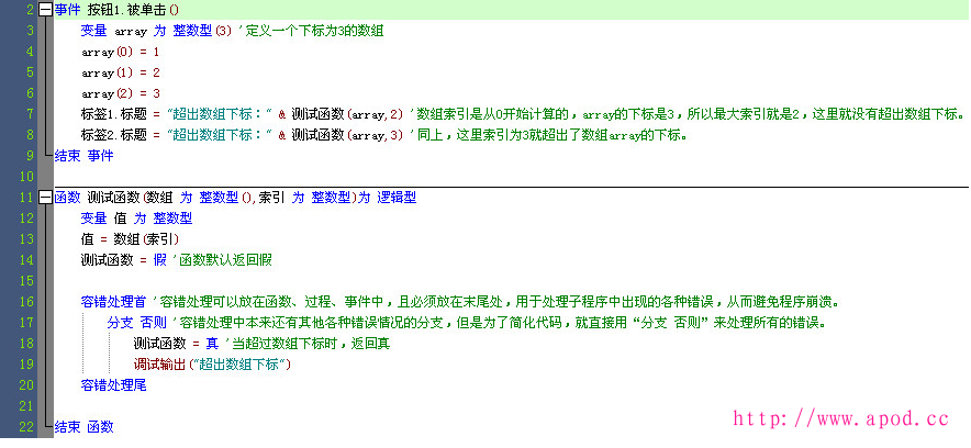 容错处理用于处理运行时错误,它必须放在子程序(函数、过程、事件)的末尾处,这也意味着每个子程序只能有一个容错处理。如果子程序没有产生运行时错误,那么容错处理语句将不会被执行。容错处理的意义很重要,当子程序在执行过程中发生错误时,容错处理中的语句将被执行,从而避免整个应用直接崩溃。