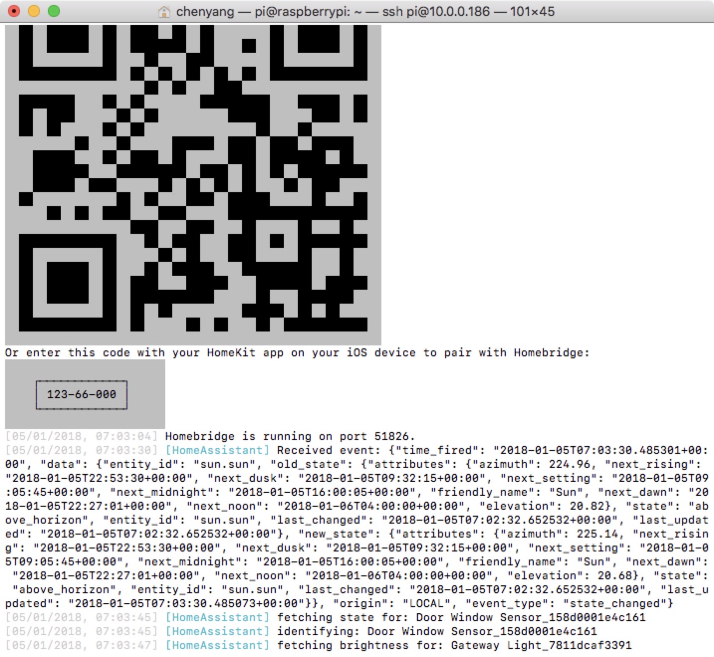 打开两个命令窗口,分别运行hass和homebridge,如果桥接成功,homebridge运行窗口会出现通讯内容,如下图