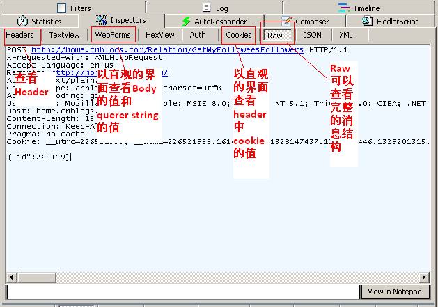 Inspectors tab下有很多查看Request或者Response的消息。 其中Raw Tab可以查看完整的消息,Headers tab 只查看消息中的header. 如下图