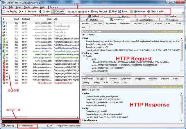 看看Fiddler的基本界面
