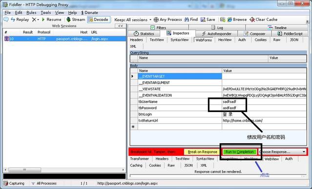 1. 用IE 打开博客园的登录界面 http://passport.cnblogs.com/login.aspx2. 打开Fiddler, 在命令行中输入bpu http://passport.cnblogs.com/login.aspx3. 输入错误的用户名和密码 点击登录4. Fiddler 能中断这次会话,选择被中断的会话,点击Inspectors tab下的WebForms tab 修改用户名密码,然后点击Run to Completion 如下图所示。5. 结果是正确地登录了博客园