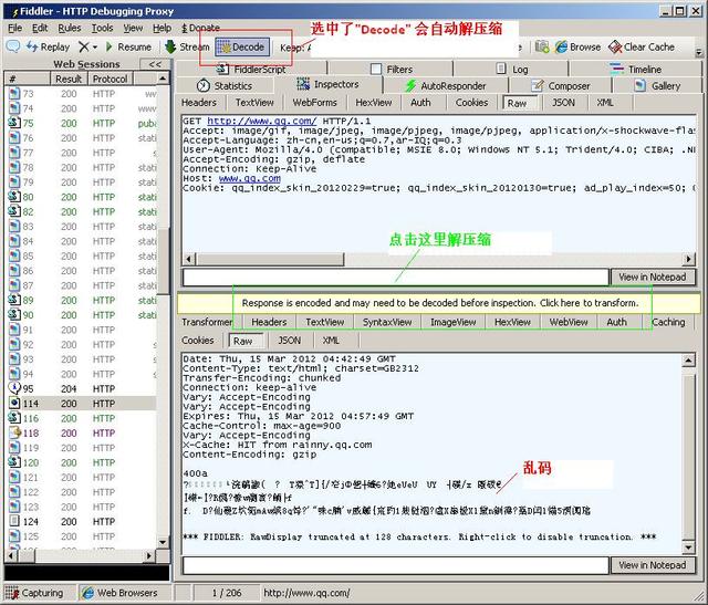 有时候我们看到Response中的HTML是乱码的, 这是因为HTML被压缩了, 我们可以通过两种方法去解压缩。