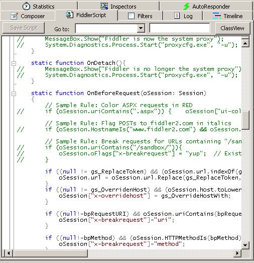 Fiddler最复杂的莫过于script系统了 官方的帮助文档: http://www.fiddler2.com/Fiddler/dev/ScriptSamples.asp
