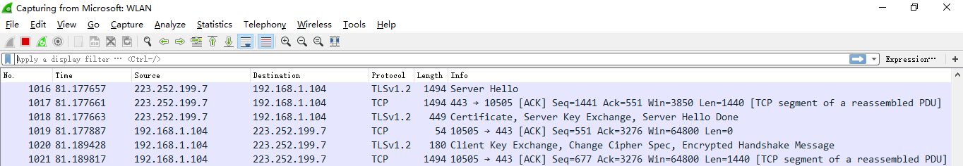 ip.addr == 192.168.1.104 显示源IP地址或目标IP地址为192.168.1.104的数据包列表