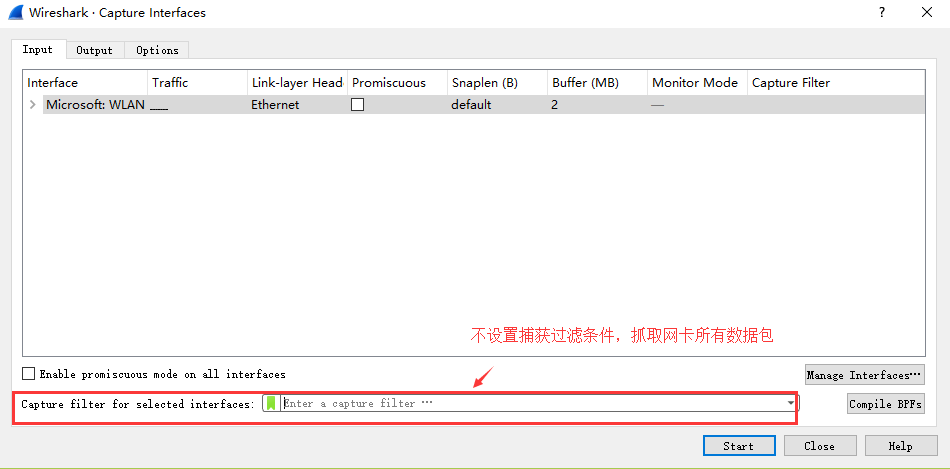 2、选择菜单栏上Capture -> Option,勾选WLAN网卡(这里需要根据各自电脑网卡使用情况选择,简单的办法可以看使用的IP对应的网卡)。点击Start。启动抓包。