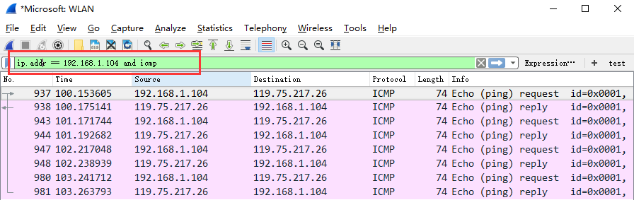 过滤多个条件组合时,使用and/or。比如获取IP地址为192.168.1.104的ICMP数据包表达式为ip.addr == 192.168.1.104 and icmp