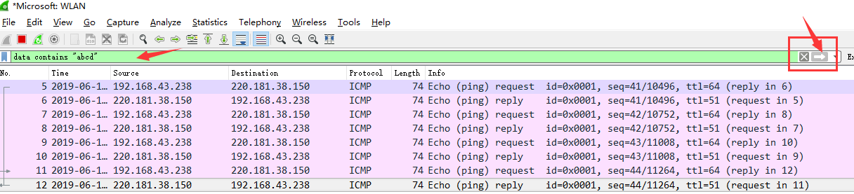 后面条件表达式就需要自己填写。如下我想过滤出data数据包中包含"abcd"内容的数据流。包含的关键词是contains 后面跟上内容。
