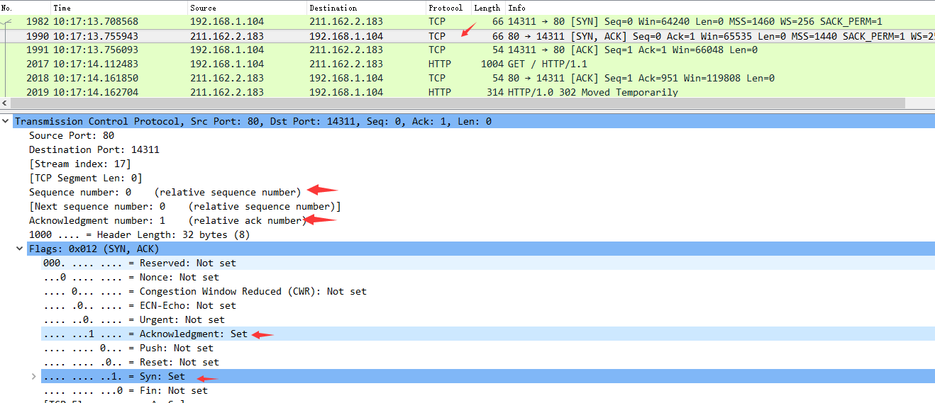 服务器发回确认包, 标志位为 SYN,ACK. 将确认序号(Acknowledgement Number)设置为客户的I S N加1以.即0+1=1, 如下图