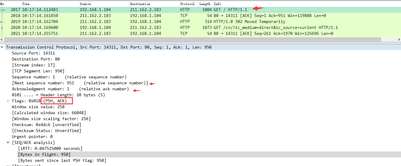 图中可以看到wireshark截获到了三次握手的三个数据包。第四个包才是HTTP的, 这说明HTTP的确是使用TCP建立连接的。