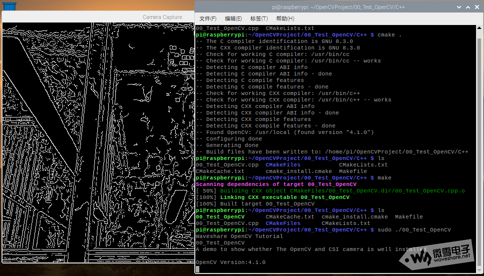 { cout << "Waveshare OpenCV Tutorial"<< endl; cout << "00_Test_OpenCV"<cout << "A demo to show whether The OpenCV and CSI camera is well installed" <cout << endl; cout << "OpenCV Version:" << CV_VERSION << endl; // 0: use CSI camera,1:use USB camera