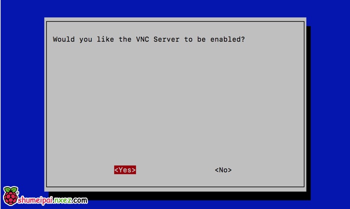 依次操作:Interfacing Options -> VNC -> Yes。之后系统会提示你是否要安装 VNC 服务,输入 y 之后回车,等待系统自动下载安装完成,一切顺利的话 VNC 服务就启动了!