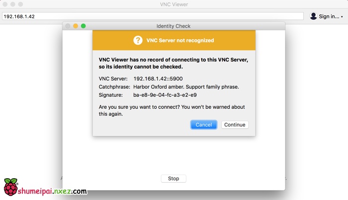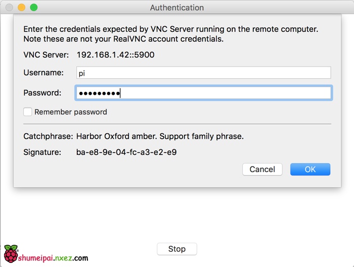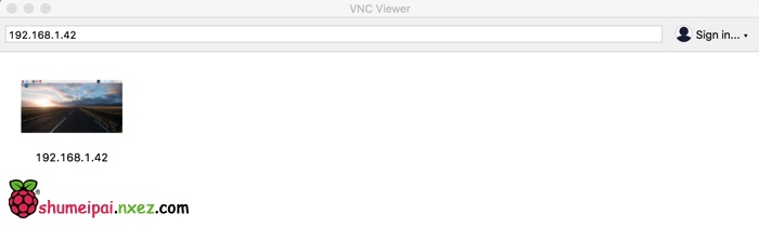 运行 RealVNC Viewer 之后输入树莓派的 IP 地址,通过 ifconfig 命令可以查看。选择连接之后输入树莓派的登录用户名密码,初始用户名 pi,密码为 raspberry。确认之后即可进入树莓派的远程桌面!